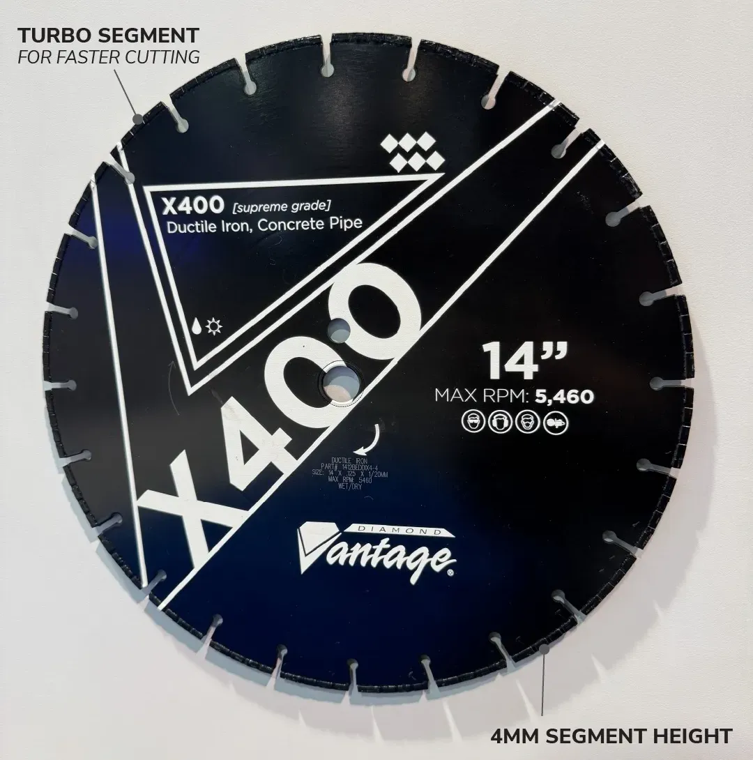 The X400 Supreme Ductile Iron Blade is designed for superior durability and performance. Perfect for experienced users, this blade delivers longer life and efficient cutting for ductile iron and concrete pipe projects. Built to handle the toughest jobs, it combines precision engineering with premium materials for unmatched results.